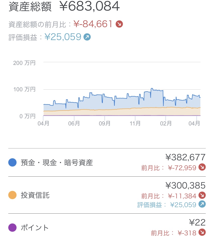 3月末の予想通りカードの引き落としで資産が減少+株価も下がっているので想像よりも資産が減少しました。 ただ投資信託については、気楽に気長に構えているのでそこまで気にしてません(気にしてもどうしようもないというのが正しいですが😗)