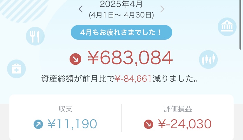 今月は、収支+11,190円でした。前月と逆で収支はプラスなのに資産は減少という結果になりました。今月は前月ほどクレカを使って無いので来月のカードの支払いはマシですが、毎年5月は自動車税の支払いがあるので厳しそうです😭